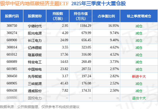 从基金规模来看,银华中证内地低碳经济主题ETF基金2025年三季度公布的基金规模为0.7亿元,较上一期规模5788.31万元变化了1196.66万元,环比变化了20.67%。该基金最新一期资产配置为:股票占净值比98.59%,无债券类资产009配资,现金占净值比1.79%。从基金持仓来看,该基金当季前十大股票仓位达59.77%,第一大重仓股为宁德时代(300750),持仓占比为16.95%。