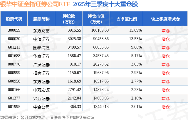 本站消息,日前银华中证全指证券公司ETF基金公布三季报搭搭网,2025年三季度最新规模66.84亿元,季度净值涨幅为11.38%。